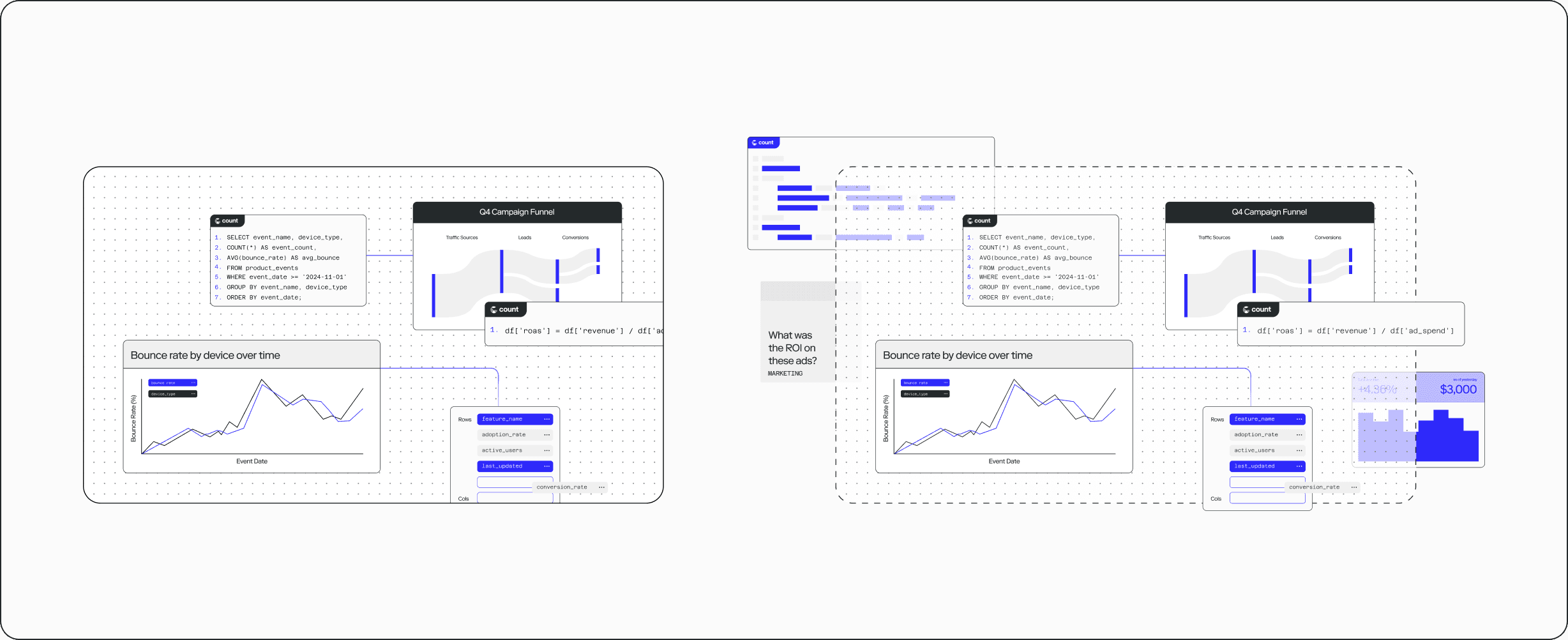 Unlike most AI you've used, Count doesn't hide away its thinking. Every agent's conversation persists and is visible to all, and every cell it creates is, well, just another cell in the canvas. You can view, audit, approve, and even edit SQL, or change no-code visuals and tables.